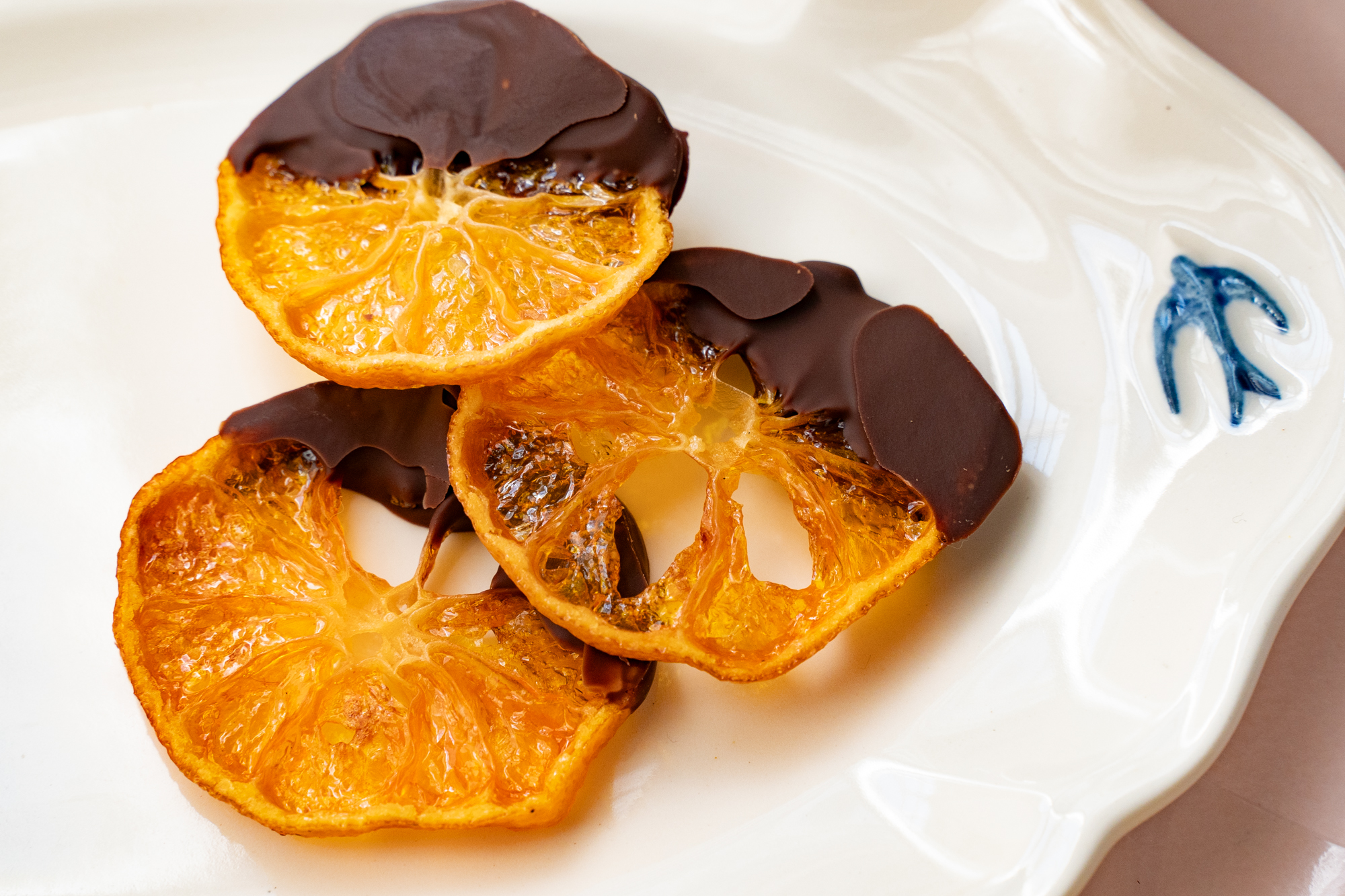 薄切りで、カリッとした食感を楽しめる輪切り甘夏オランジェットです。少しビターなチョコレートでコーティングしました。飴のような味わいです。