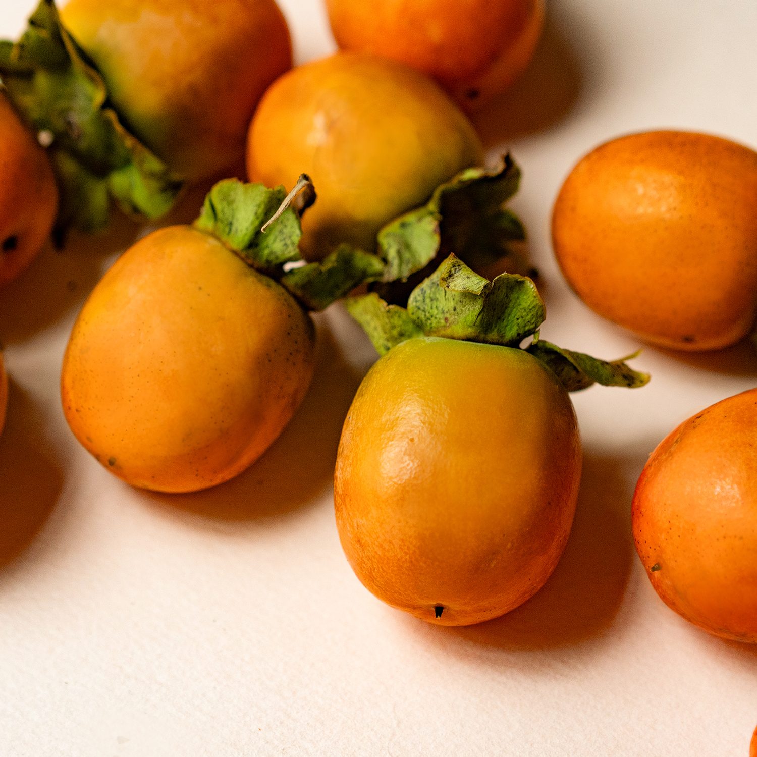 一般的な柿よりも小ぶりな柿です。柿を切ると断面には黒い斑点があります。黒い理由は果肉に含まれるタンニンが変化するためで、黒くなるとより甘い味になります。